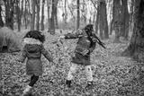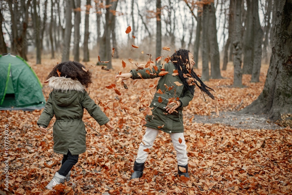 Two little black sisters playing near tent camping in the autumn forest
