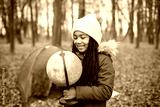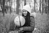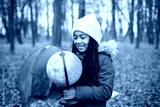 One little black girl holding a globe in tent camping in the autumn forest