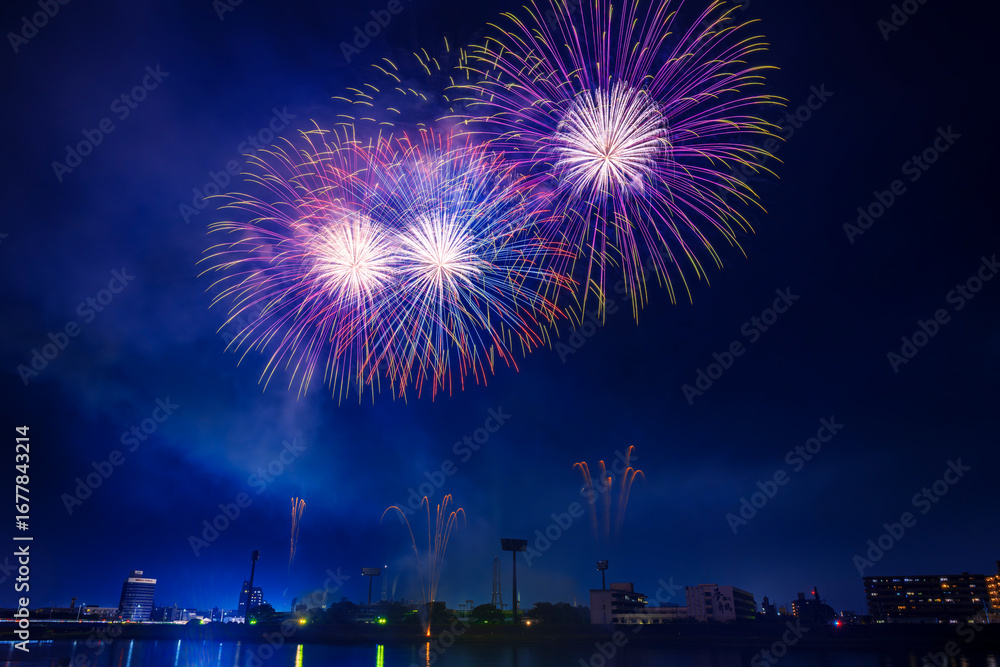 色とりどりの花火が夜空を彩る花火大会の夜景