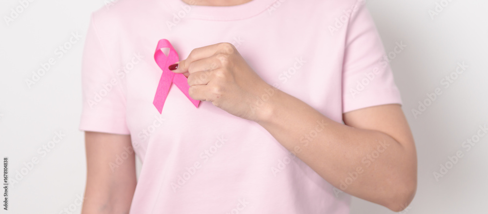 Pink October Breast Cancer Awareness month, woman with pink Ribbon for concepts of support people life and illness. National cancer survivors month, Women Health day and February World cancer day