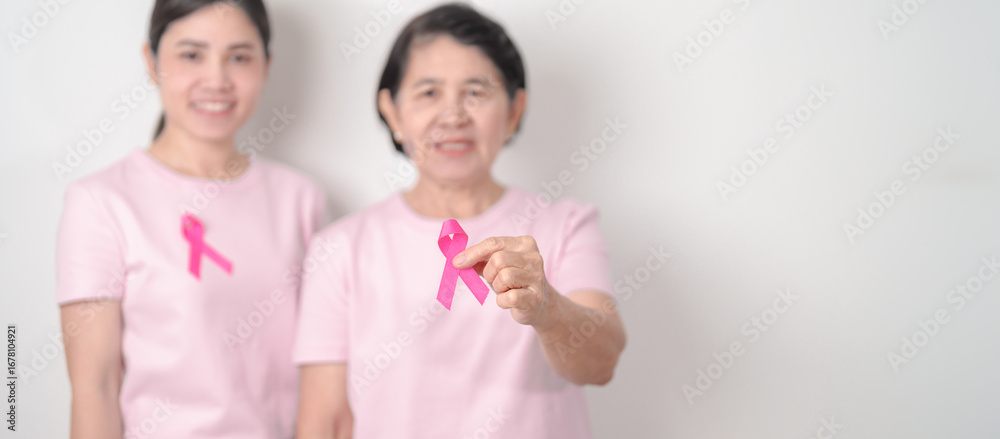 Couple woman with pink Ribbon for Pink October Breast Cancer Awareness month, May Women Health, November Birth Parents Adoption, women rights, Empowerment, March International Women day and Cancer day