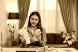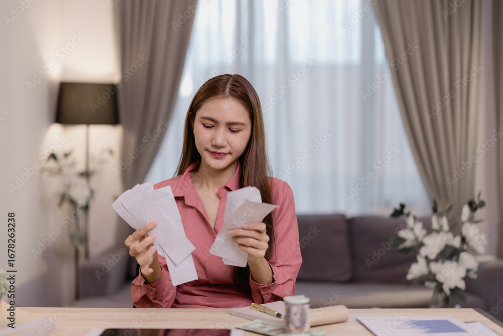 Young woman managing monthly expenses and debt, reviewing financial documents, analyzing invoices, and calculating domestic bills using calculator, sitting at table in living room at home