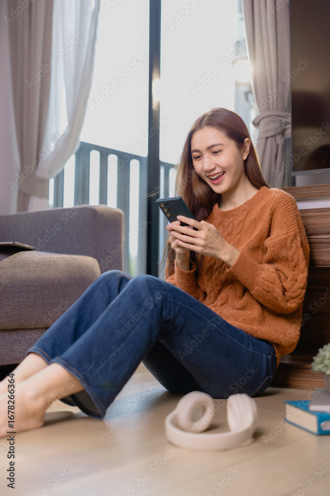 Happy young woman sitting on the floor of her cozy living room, using her smartphone while smiling and enjoying her time at home in casual, comfortable clothing