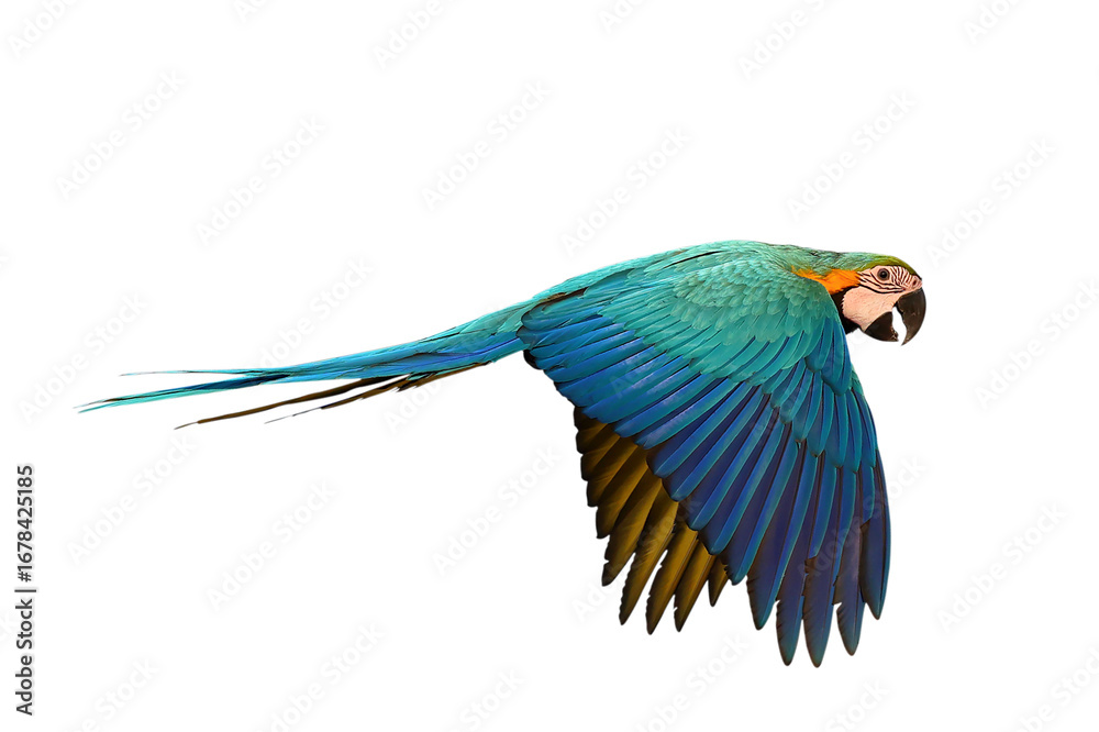 Colorful flying Blue and Gold Macaw parrot isolated on transparent background png file