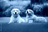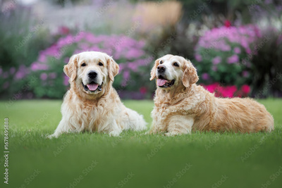two happy golden retriever dogs lying on grass in a beautiful park