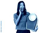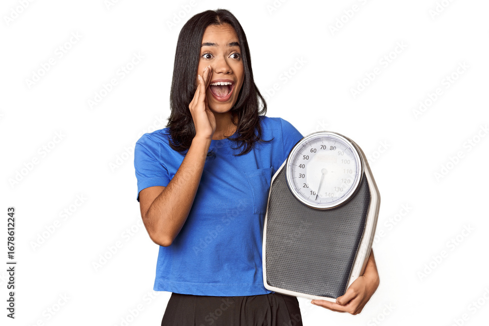 Filipino woman with scale in studio shouting and holding palm near opened mouth.