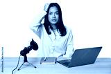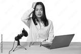 Woman records podcast with laptop being shocked, she has remembered important meeting.