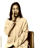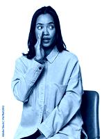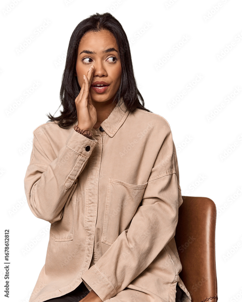 Young woman sitting in chair in studio is saying a secret hot braking news and looking aside