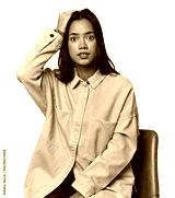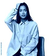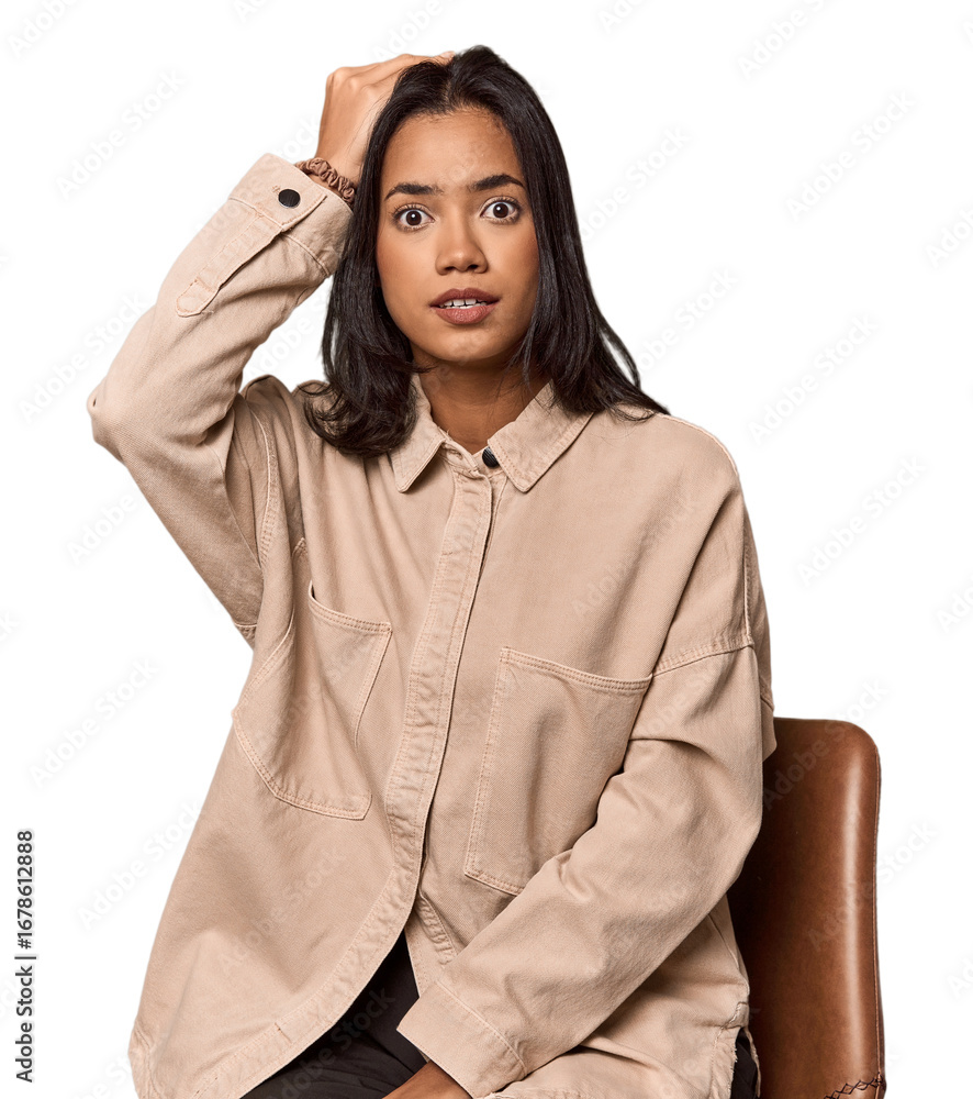 Young woman sitting in chair in studio being shocked, she has remembered important meeting.