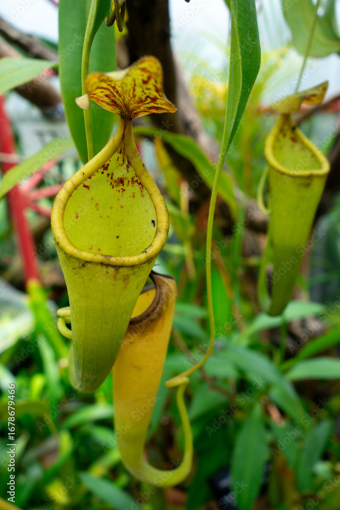 Close-up of nepenthes plant with vibrant green traps and tropical leaves
