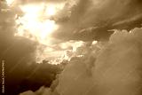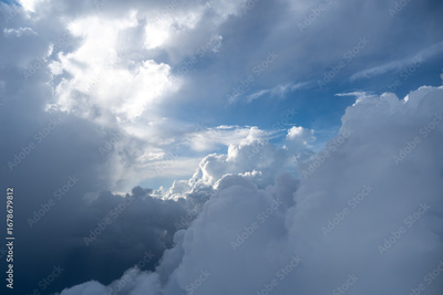 Dramatic sky with sunbeams and clouds seen from an airplane