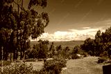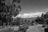 Lush green landscape overlooking Lake Titicaca from Llachon, Peru