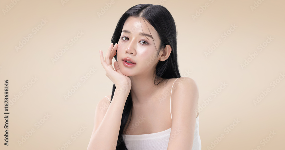 Close up perfect beauty face of young beautiful Asian woman posing gracefully with a soft smile isolated on brown background. Facial and skin care concept for commercial advertising.