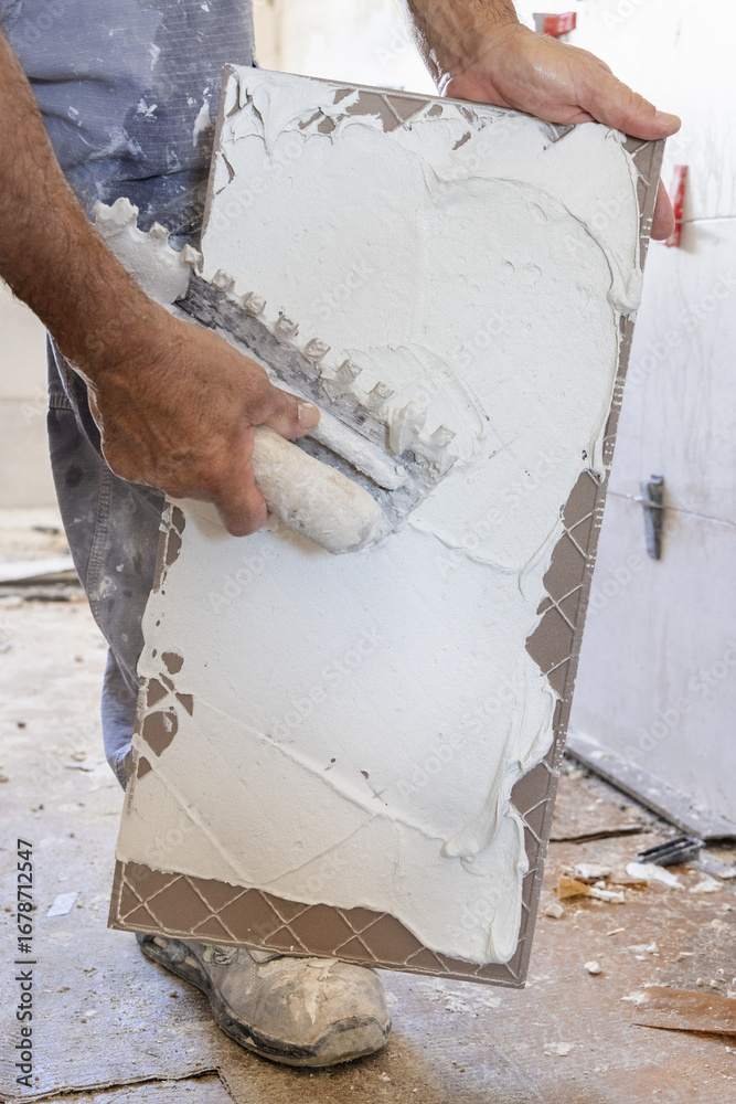 Craftsman spreads tile adhesive with notched trowel on a tile back, closeup. Construction process