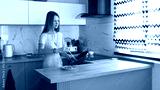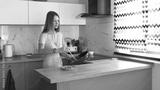 A young romantic woman cooked herself lunch. She puts the food out of the pan onto her plate with a wooden spoon