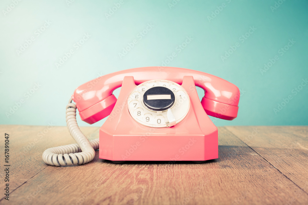 Retro telephone front mint green wall background. Old style filtered photo
