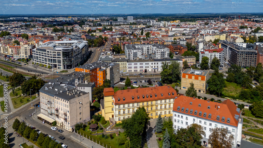 Aerial panorama of Wrocław city center, modern buildings, streets and historic townhouses, red rooftops, urban architecture, Lower Silesia, Poland, scenic city landscape view.