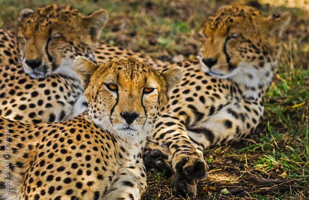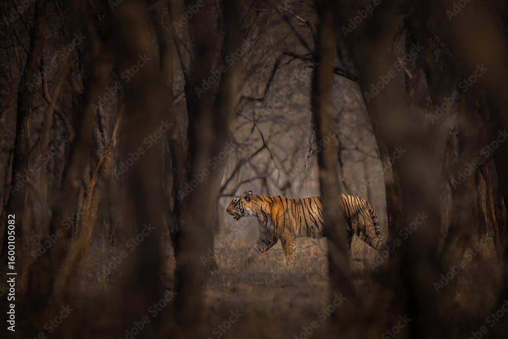 Great tiger male in the nature habitat. Tiger walk during the golden light time. Wildlife scene with danger animal. Hot summer in India. Dry area with beautiful indian tiger, Panthera tigris
