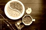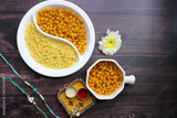 A close up of traditional Indian snacks. crispy savory sev and sweet golden boondi served together. Perfect flavors in authentic Indian namkeen and festive treats. sev bundi.