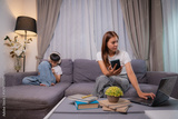 Asian businesswoman sitting on the sofa in her living room and managing her finances using a calculator and her laptop, her son is sitting next to her playing with his phone and wearing headphones