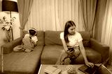 Asian businesswoman using laptop and smartphone working from home sitting on the couch, her son is playing videogames with headphones on a tablet, ignoring each other