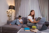 Asian mother reading a book and working from home, sitting on a comfortable sofa in the living room, while her son is lying down, using a tablet with headphones