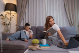 Asian mother working remotely from home, holding a book and using her laptop, while her son is lying on the sofa using a tablet and wearing headphones