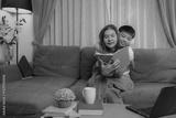 Asian mother and son reading a book together while sitting on sofa with laptop on the table in living room at home, family and education concept