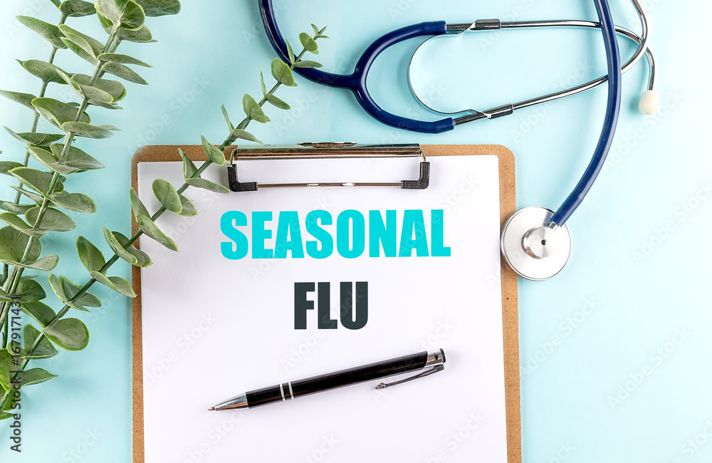 Clipboard with text seasonal flu on white paper , stethoscope, pen and green plant on blue background