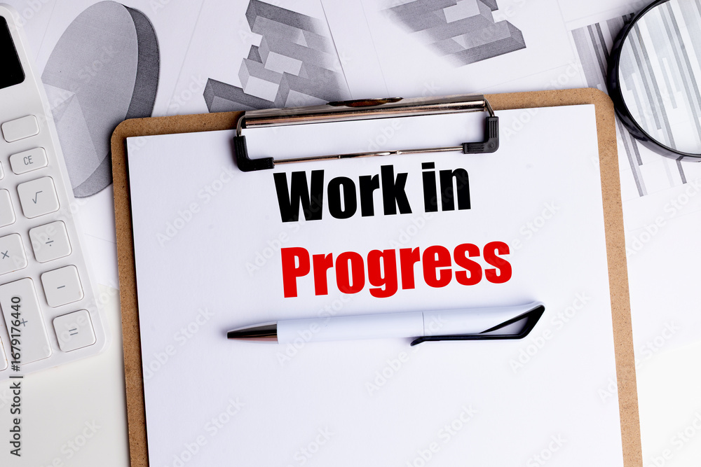 Clipboard with paper showing the words work in progress, along with a pen, calculator, charts,
