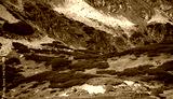 Green mountain slope with a rocky outcrops and scattered bushes in sunlight