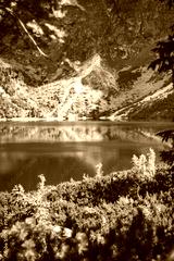 Turquoise alpine lake surrounded by green pine forest and rocky mountain slopes