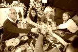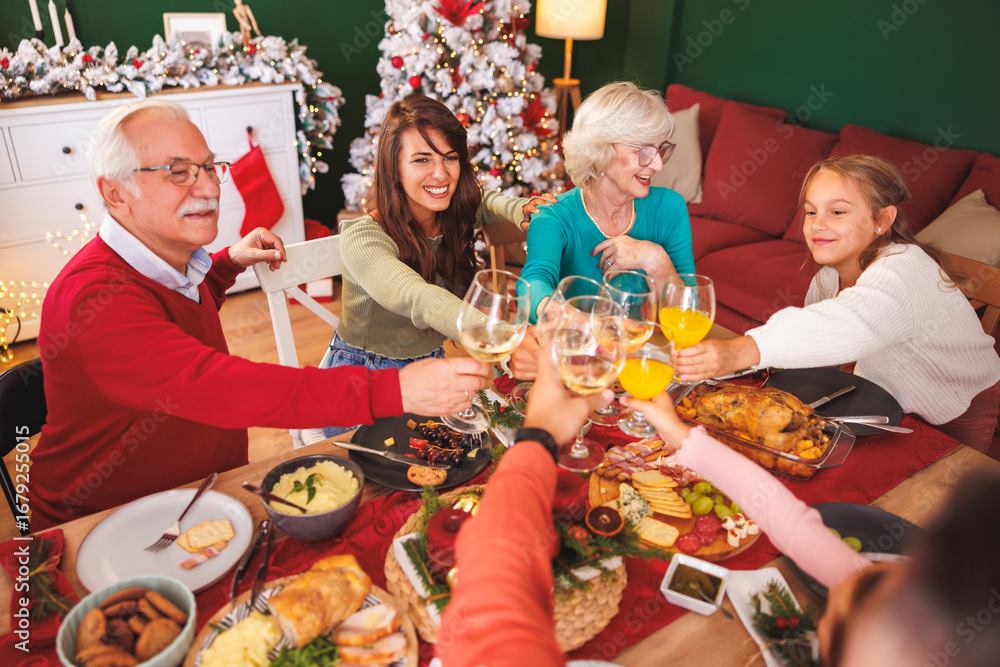 Multi-generation family making a toast while having Christmas dinner at home