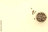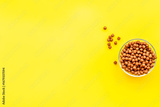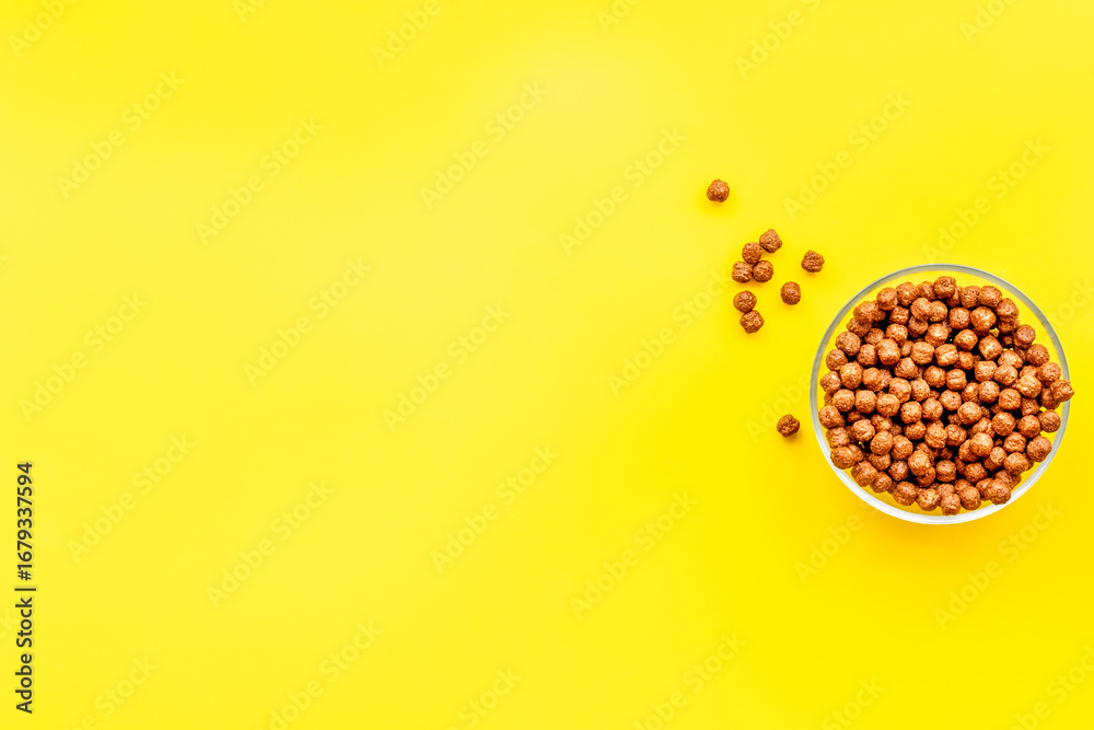 Cereals and flakes from corn and oat on yellow background top view mockup