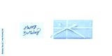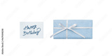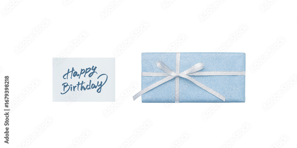A pale blue gift box and a birthday card with blue handwritten lettering, overhead view