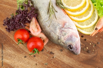 Raw tasty fish with cooked vegetables
