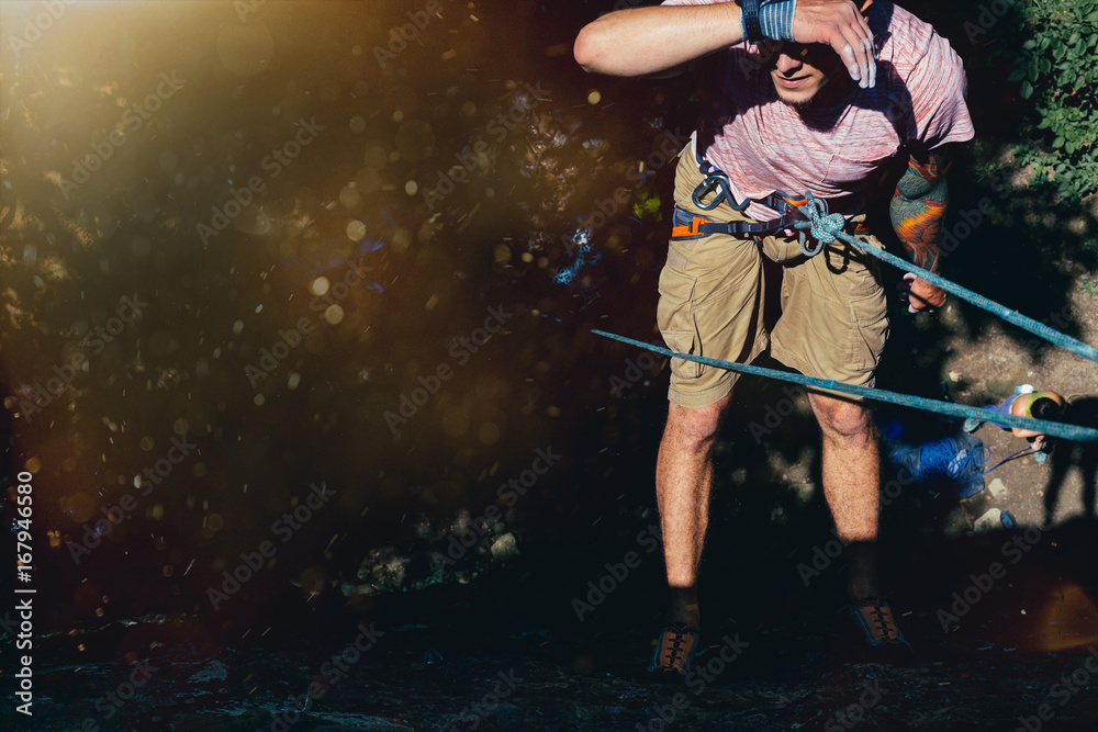 Young Climber Hanging On A Rock On A Rope And Looks Somewhere On The Wall. Extreme Lifestyle Outdoor Activity Concept