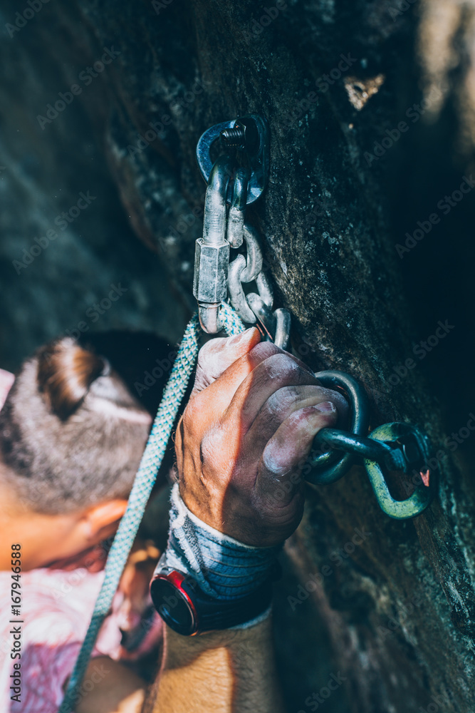 Climber Man Climbing On The Rock, Close-up Of Hand With Tape In Magnesium Powder