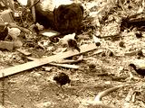 Group of small chicks walking on dry ground with scattered debris. Growth, survival and rural poultry farming environment with natural outdoor setting.