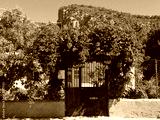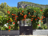 Orange trumpet flowers growing along white wall of building. Nature, beauty, and summer travel lifestyle with exotic outdoor vegetation.