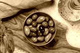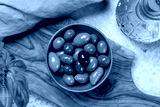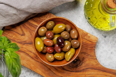 An assortment of various olives presented in a bowl, showcasing different colors, textures, and flavors