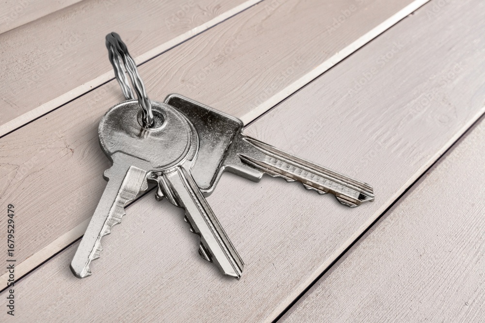 Set of house metal keys on the wooden table