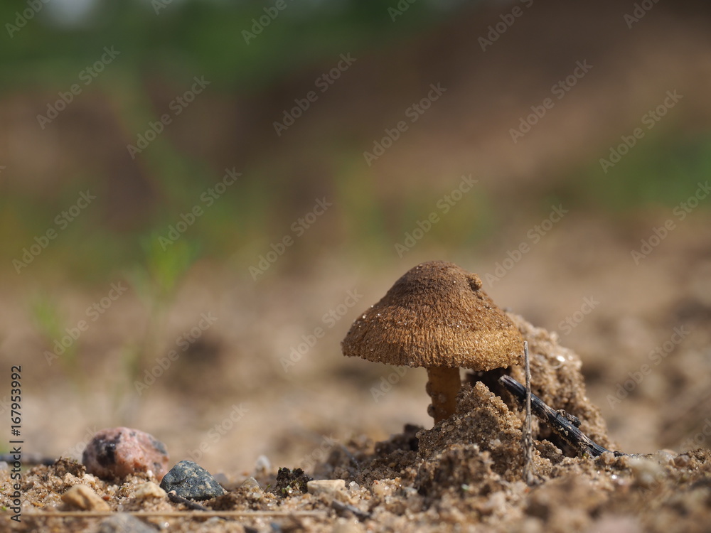 Mushroom toadstool growing in the sand. Macro
