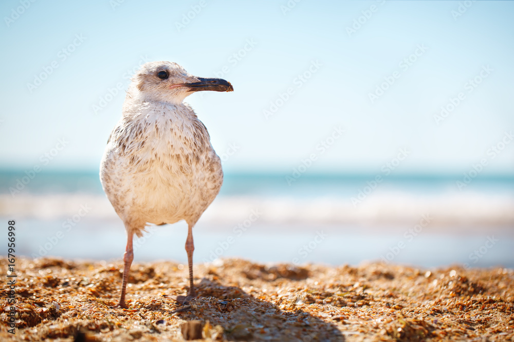 Seagull on a sandy sea shore .