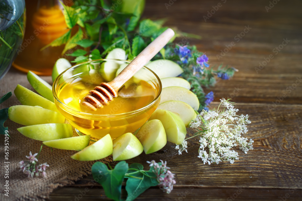 Fresh honey, field flowers and ripe apples on a wooden table.