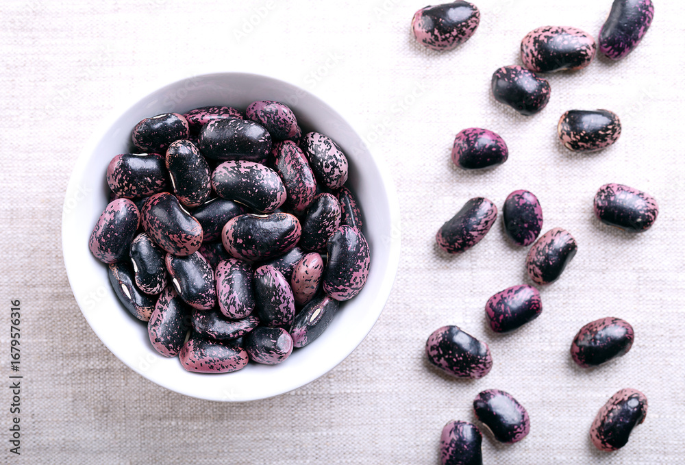 Dried scarlet runner beans in a white bowl on linen. Raw and large seeds of purple colored speckled runner beans, a variety of Phaseolus coccineus, also known as multiflora bean, butter, or fire bean.