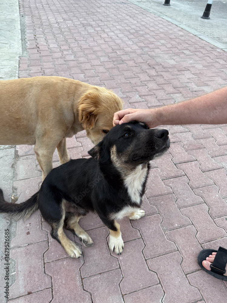 Two dogs interacting with person on city street. Domestic animals, companionship and everyday urban lifestyle with pets.