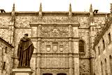 University of Salamanca, It is the oldest founded university in Spain and the second oldest European university . Plateresque facade and statue in foreground.