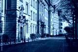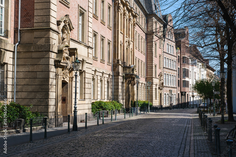 Historic cobblestone street Altestadt lined with elegant buildings in Düsseldorf, Germany