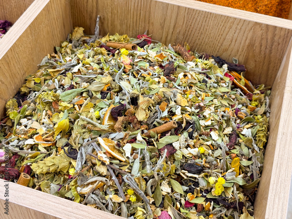 Herbal tea blend with dried flowers, leaves, and spices. Wellness tradition, natural remedies and cultural tea preparation heritage.